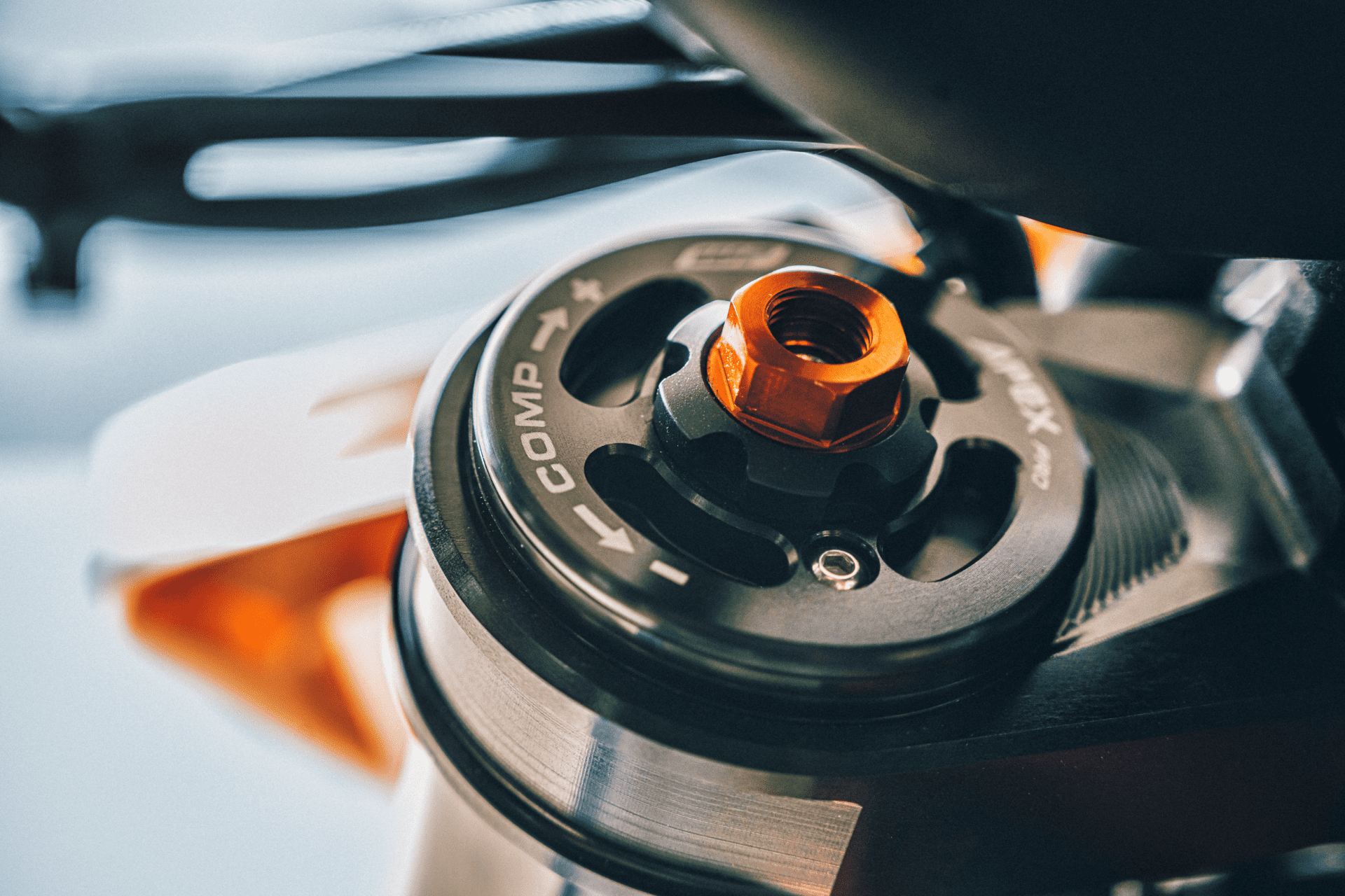 APEX PRO 7548フォークは、KTM 1290 SUPER DUKE Rのために細部まで煮詰めて、よりスポーティで繊細な操作感を残し特別に作成されました。APEX PRO 7548フォークは、レース志向のモーターサイクリストやプロのレーサーのために最高のパフォーマンスを保証します。フルアジャスタブルのコンプレッションダンピングとリバウンドダンピングにより、個々のダンピング特性を細かく個別にチューニングすることが可能です。WP APEX PRO 7548フォークは、内部リザーバーを備えおり、このリザーバー内のオイルに圧力をかけることで、より安定したダンピングを実現します。 APEX PRO 7548フォークは、APEX PRO 7746ショックと組み合わせることができるため、KTM 1290 SUPER DUKE Rを自在にコントロールする事が可能です。
